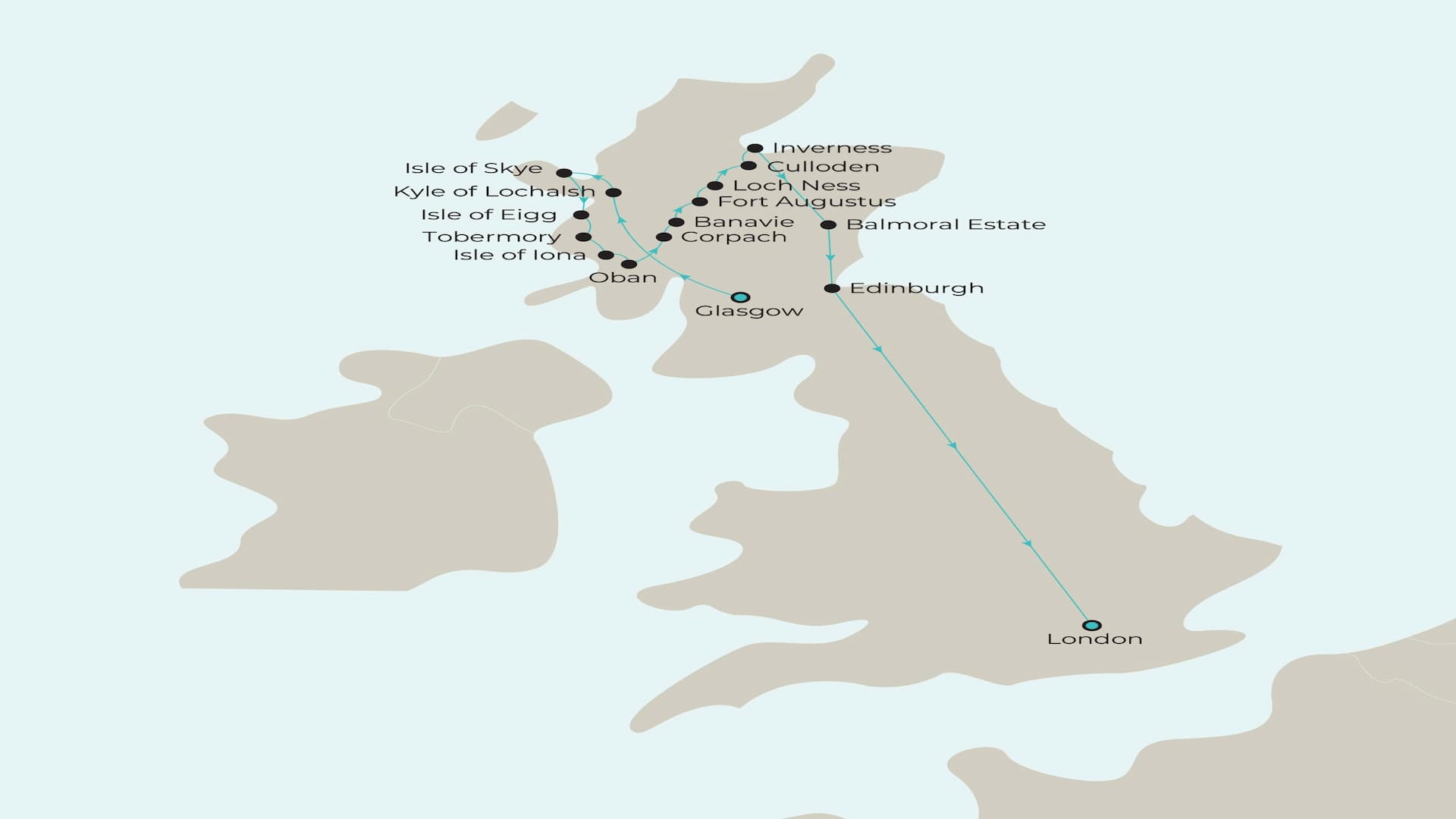 | Arrive | Details | Depart | Day 1 | Fly Overnight to Glasgow - Your holiday begins as you fly f rom Australia to your destination. | 12:00 | Day 2 | Glasgow: Hotel Stay - Landing in Scotland’s largest city, Glasgow, you’ll begin your holiday with an overnight hotel stay. Overnight: voco ® Grand Central Glasgow. | Day 3 | Kyle of Lochalsh: Embark Ship & Overnight in Port - Embark the welcoming and the wonderful Lord of the Glens, a remarkable vessel offering the perfect way to discover Scotland’s romantic Highlands and coastal charms in a relaxed and intimate setting. Meals Included: Breakfast, Lunch and Dinner. Overnight: Lord of the Glens. | Day 4 | Kyle of Lochalsh - This morning, get your cameras ready as you visit the iconic Eilean Donan Castle, perched on an island where three sea lochs converge, surrounded by breathtaking scenery and steeped in history – an unforgettable highlight of the Scottish Highlands. Meals Included: Breakfast, Lunch and Dinner. Overnight: Lord of the Glens. | Day 4 | Kyle of Lochalsh - This morning, get your cameras ready as you visit the iconic Eilean Donan Castle, perched on an island where three sea lochs converge, surrounded by breathtaking scenery and steeped in history – an unforgettable highlight of the Scottish Highlands. Meals Included: Breakfast, Lunch and Dinner. Overnight: Lord of the Glens. | Day 5 | Isle of Eigg - This morning, sail to the captivating Isle of Eigg, where a spirited community of just 90 people thrives beneath the dramatic, jagged silhouette of An Sgùrr – a striking 1234 pitchstone ridge that defines the island’s wild, rugged charm. Meals Included: Breakfast, Lunch and Dinner. Overnight: Lord of the Glens. | Day 5 | Tobermory - Next, you’ll cruise around Ardnamurchan, the British mainland’s westernmost point, to the Isle of Mull and its colourful capital, Tobermory. Enjoy f ree time in this charming harbour town, where vibrant houses once housed workers of the British Fisheries Company. Meals Included: Breakfast, Lunch and Dinner. Overnight: Lord of the Glens. | Day 6 | Isle of Iona - From Craignure, you’ll travel to the sacred Isle of Iona, where Saint Columba brought Christianity to Scotland and around 50 Scottish kings are buried. Explore the beautifully restored Benedictine Abbey and soak in the island’s deep tranquillity. Meals Included: Breakfast, Lunch and Dinner. Overnight: Lord of the Glens. | Day 6 | Oban: Overnight in Port - As evening falls, you’ll sail into Oban, known as the seafood capital of the Highlands. This charming coastal town welcomes you with f resh catches, stunning harbour views, and a lively atmosphere that celebrates Scotland’s rich maritime heritage. Meals Included: Breakfast, Lunch and Dinner. Overnight: Lord of the Glens. | Day 7 | Oban - Explore Oban, the gateway to the Isles, with a guided walk to McCaig’s Tower. Perched on Battery Hill, this striking landmark – modelled after the Roman Colosseum – offers panoramic views and a glimpse into local history. Meals Included: Breakfast, Lunch and Dinner. Overnight: Lord of the Glens. | Day 7 | Corpach - Later, glide along the mysterious waters of Loch Linnhe, surrounded by hidden lochs and islands. Arriving at Corpach, you’ll board the legendary West Highland Railway, crossing the iconic Glenfinnan Viaduct – an unforgettable journey through breathtaking Highland beauty. Meals Included: Breakfast, Lunch and Dinner. Overnight: Lord of the Glens. | Day 8 | Banavie - Unwind as the Lord of the Glens climbs Neptune’s Staircase – eight linked locks lifting you 64 feet to Banavie. You’ll then sail through serene Lochs Lochy and Oich, along Laggan Avenue and descend into Loch Ness. Meals Included: Breakfast, Lunch and Dinner. Overnight: Lord of the Glens. | Day 8 | Fort Augustus: Overnight in Port - As evening falls, you’ll glide into Fort Augustus where you’ll dock overnight in this enchanting village at Loch Ness’s edge, where tranquil waters and dramatic Highland landscapes invite you to relax beneath a starlit Scottish sky. Meals Included: Breakfast, Lunch and Dinner. Overnight: Lord of the Glens. | Day 9 | Loch Ness - This morning, journey into the legendary waters of Loch Ness, pausing halfway for a memorable photo opportunity of Urquhart Castle. Nestled beside the loch, the castle’s dramatic silhouette offers a captivating glimpse into Scotland’s rich history and folklore. Meals Included: Breakfast, Lunch and Dinner - Overnight: Lord of the Glens. | Day 9 | Culloden - Your final stop before reaching Inverness is Culloden, the infamous battlefield where Bonnie Prince Charlie’s Jacobite forces met defeat in 1746. Explore the mysterious ancient standing stones of Clava Cairns, steeped in history and Celtic legend. Meals Included: Breakfast, Lunch and Dinner. Overnight: Lord of the Glens. | Day 9 | Inverness: Overnight in Port - Arriving in Inverness, enjoy a heartfelt farewell reception on board, followed by a sumptuous dinner, celebrating the unforgettable experiences and breathtaking landscapes of the Scottish Highlands with newfound f riends. Meals Included: Breakfast, Lunch and Dinner. Overnight: Lord of the Glens. | Day 10 | Inverness: Disembark Ship & Hotel Stay - Disembarking in Inverness, you’ll next settle into your charming hotel for a two-night stay. Immerse yourself in the city’s rich history and vibrant culture as you explore its cobbled streets and breathe in the stunning Highland scenery. Meals Included: Breakfast. Overnight: Kingsmills Hotel. | Day 11 | Inverness: Tour & Hotel Stay - No visit to Scotland would be complete without a whisky distillery tour and tasting. Embark on an insightful journey through the whisky-making process and savour a variety of whiskies to appreciate their distinct flavours. Meals Included: Breakfast. Overnight: Kingsmills Hotel. | Day 12 | Balmoral Estate: Tour & Edinburgh Hotel Stay - Today you’ll transfer to Edinburgh for a twonight hotel stay. Alon