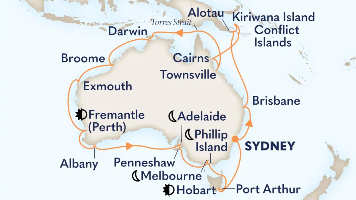 Sydney, Australia ► Brisbane, Australia ► Townsville, Australia ► Cairns, Australia ► Alotau, Papua New Guinea ► Kiriwina Island, Papua New Guinea ► Conflict Islands (Panawal Group) ► Port Moresby, Papua New Guinea ► Scenic Cruising Torres Strait ► Darwin, Australia ► Broome, Western Australia ► Exmouth, Australia ► Fremantle (Perth) ► Albany, Western Australia ► Adelaide, South Australia ► Penneshaw, Kangaroo Island ► Melbourne, Australia ► Phillip Island, Victoria ► Hobart, Tasmania ► Port Arthur, Australia ► Sydney, Australia