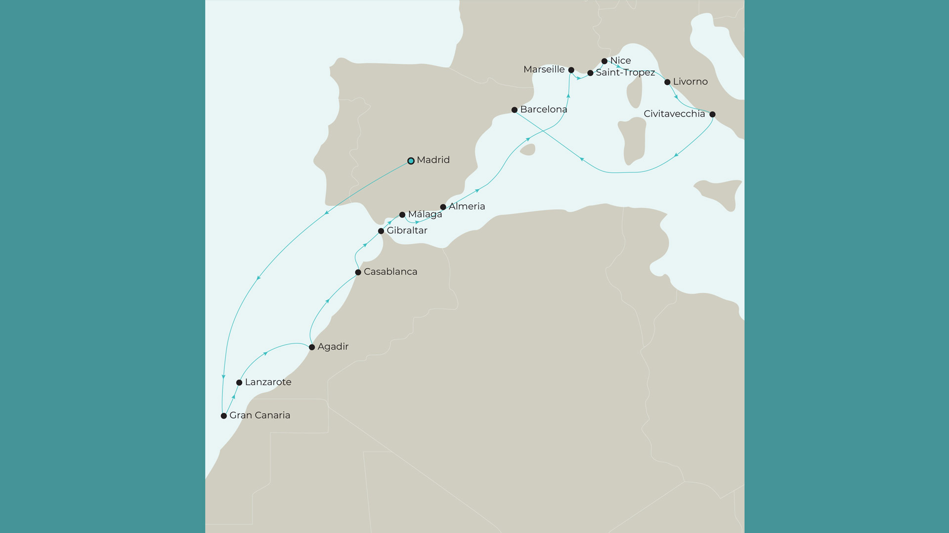 Arrive | Details | Depart | Day 1 | Fly Overnight to Madrid - Your holiday begins as you fly f rom Australia to your destination. | 12:00 | Day 2 | Madrid: Hotel Stay - Landing in the capital of Spain, Madrid, you’ll begin your holiday with an overnight hotel stay. Overnight: Radisson RED Madrid. | Day 3-4 | Gran Canaria: Hotel Stay - Flying to Gran Canaria, you’ll next savour a two-night escape. Known as the “miniature continent” , it’s known f rom its striking contrasts. Sun-drenched beaches line the coast, while its interior reveals volcanic peaks, f ragrant pine forests and secluded villages. Meals Included: Breakfast. Overnight: Suites & Villas by Dunas. | Day 5 | Gran Canaria: Embark Ship - Today, you’ll embark the newest addition to the Azamara fleet, Azamara Onward. Enjoy a cruising experience unlike any other on board this stunning small ship, built to explore remote destinations that larger ships cannot reach. Meals Included: All-Inclusive Board Basis. Overnight: Azamara Onward. | Day 6 | Lanzarote - Lanzarote, one of the stunning Canary Islands, boasts aquamarine waters, whitesand beaches, and year-round sunshine. From this unique volcanic environment emerged black-ash vineyards, producing bold, award-winning wines and lending the island a striking, otherworldly beauty. Meals Included: All-Inclusive Board Basis. Overnight: Azamara Onward. | Day 7 | Agadir - As southern Morocco’s most visited city, Agadir boasts palm-f ringed boulevards and endless beaches. Immerse yourself in the sights and sounds of Agadir’s walled souk, barter up a storm for some of the region’s traditional wares or visit the Agadir Kasbah. Meals Included: All-Inclusive Board Basis. Overnight: Azamara Onward. | Day 8 | Casablanca - Step into the timeless allure of Casablanca. With its blend of tradition and modernity, bustling markets, and rich history, it’s a city that invites you to immerse yourself in Moroccan authenticity and vibrant energy. Meals Included: All-Inclusive Board Basis. Overnight: Azamara Onward. | Day 9 | Gibraltar - Gibraltar, a unique British enclave at the southern tip of Spain, is a historic peninsula dominated by the iconic Rock of Gibraltar. The Rock is home to Europe’s only wild monkeys, Barbary macaques, who roam f reely. Meals Included: All-Inclusive Board Basis. Overnight: Azamara Onward. | Day 10 | Málaga - Andalusia’s main tourist destination, Málaga is located on the Southern coast of Spain, surrounded by mountains and overlooking the Mediterranean Sea. Málaga is one of the oldest cities in Europe and is steeped in history and culture. Meals Included: All-Inclusive Board Basis. Overnight: Azamara Onward. | Day 11 | Almería - Almería stretches along a coastline adorned with pristine beaches and is surrounded by unique semi-desert ecosystems. Its historic quarter, with narrow streets and whitewashed façades, offers a picturesque blend of traditional Spanish architecture and vibrant culture. Meals Included: All-Inclusive Board Basis. Overnight: Azamara Onward. | Day 12 | Relax At Sea | Day 13 | Marseille - Founded in 600 BC by the Greeks, Marseille boasts a rich history and has long been a sought-after destination. Whether wandering through its historic Old Port or exploring Basilique Notre-Dame de la Garde, Marseille’s charm is undeniable. Meals Included: All-Inclusive Board Basis. Overnight: Azamara Onward. | Day 14 | Saint-Tropez - This glamorous coastal resort is a magnet for A-listers and luxury yachts. Iconic beaches like Pampelonne draw throngs of sunseekers to their celebrity-f requented shores. Beyond the glitz, Saint-Tropez retains its charm — La Ponche remains a maze of cobbled streets. Meals Included: All-Inclusive Board Basis. Overnight: Azamara Onward. | Day 15 | Villefranche-sur-Mer & Monaco Grand Prix™ Race Day - The time has finally come. Take your seats in pole position, just metres f rom the pit lane, and watch in awe as some of the world’s best drivers battle for glory through narrow streets and hairpin corners. Meals Included: All-Inclusive Board Basis. Overnight: Azamara Onward. | Day 16 | Livorno - With bustling markets and a picturesque waterf ront, the port city of Livorno acts as a gateway to two of Italy’s most iconic destinations – Florence and Pisa. Visit Florence, the birthplace of the renaissance, and immerse yourself in enthralling culture. Meals Included: All-Inclusive Board Basis. Overnight: Azamara Onward. | Day 17 | Civitavecchia - Today you’ll arrive in Civitavecchia, gateway to Rome. As Italy’s capital, it’s a treasure trove of iconic landmarks and architectural marvels. The Colosseum, the Roman Forum, and the Pantheon all stand as testaments to the city’s storied past. Meals Included: All-Inclusive Board Basis. Overnight: Azamara Onward. | Day 19-20 | Barcelona: Disembark Ship & Hotel Stay - Disembarking in Barcelona, you’ll conclude your magical Mediterranean adventure with a two-night hotel stay. During time at leisure, marvel at world-famous architectural masterpieces such as the Sagrada Familia and lose yourself in the bustling streets of Las Ramblas. Meals Included: Breakfast. Overnight: Leonardo Royal Hotel Barcelona Forum. | Day 21-22 | Barcelona: Fly Home - Your holiday complete, today you’ll head to the airport for your flight home. Meals Included: Breakfast. | 06:00 |