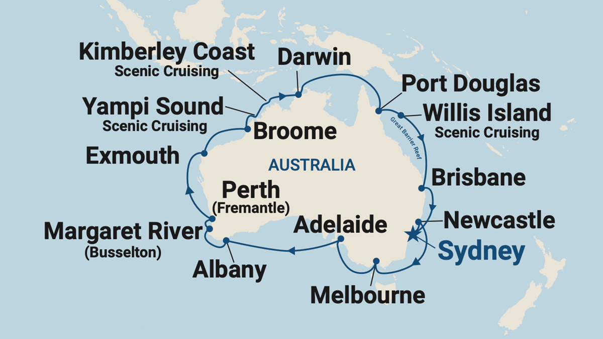 Sydney ► Newcastle ► Melbourne ► Adelaide ► Albany ► Margaret River (Busselton) ► Perth (Fremantle) ► Exmouth ► Broome ► Yampi Sound (Scenic Cruising) ► Kimberley Coast (Scenic Cruising) ► Darwin ► Port Douglas ► Willis Island ► Brisbane ► Sydney